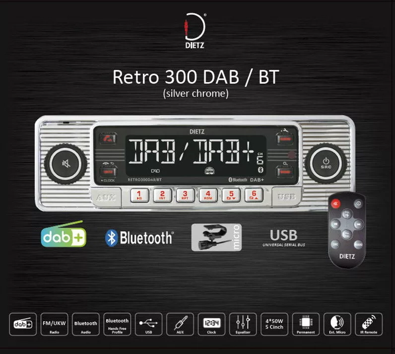 Fedezze fel a klasszikus dizájn és a legmodernebb technika tökéletes egyesülését a Dietz Retro300DAB (ezüst-króm) és Retro301DAB (fekete-króm) autórádiókkal. Ezek a retró stílusú autórádiók ideális választást jelentenek mindazok számára, akik veterán vagy fiatal klasszikus autót vezetnek – vagy egyszerűen csak nosztalgikus hangulatot vinnének a modern járműbe.