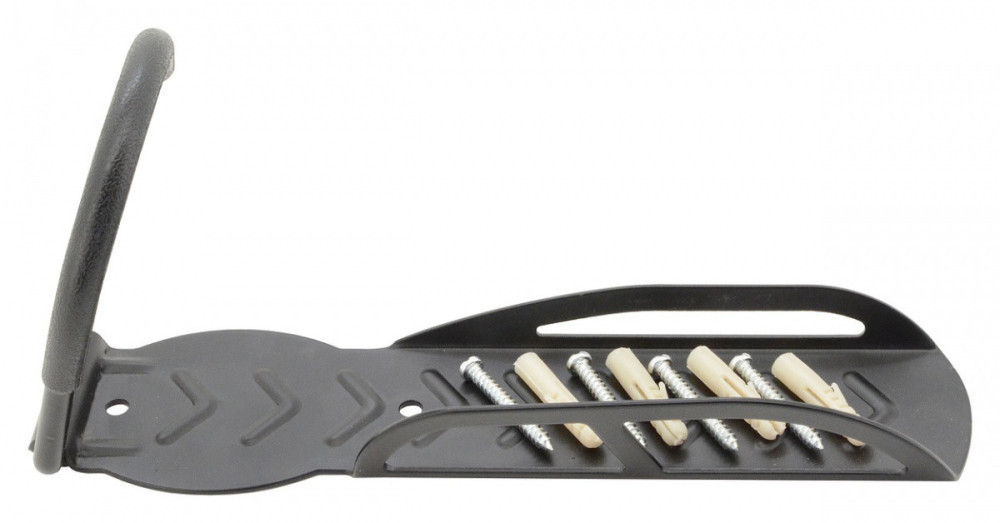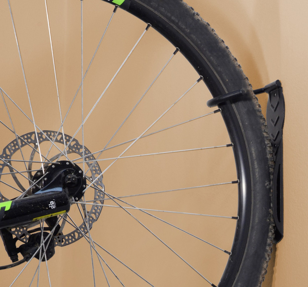 A tartó egy horoggal van felszerelve az első kerék felakasztásához vezetőlemezzel, amely megakadályozza, hogy a kerék összekoszolja a falat, és egyúttal megakadályozza a kerék oldalirányú dőlését.