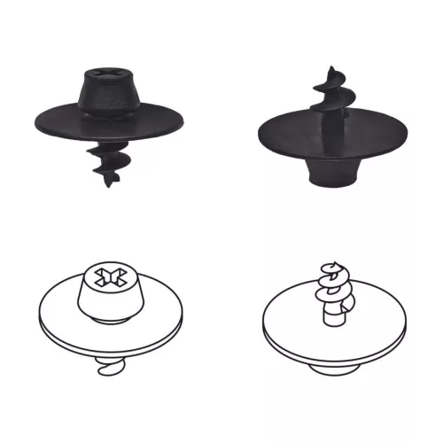 Rögzítő autószőnyegekhez. Műanyag csavar, amelyet az autó eredeti szőnyegébe csavarva szolgál a textil- vagy gumiszőnyeg rögzítésére és elmozdulás elleni biztosítására. A szőnyeg a csavar felső részére való rányomással rögzíthető. Az ár 1 darabra vonatkozik.