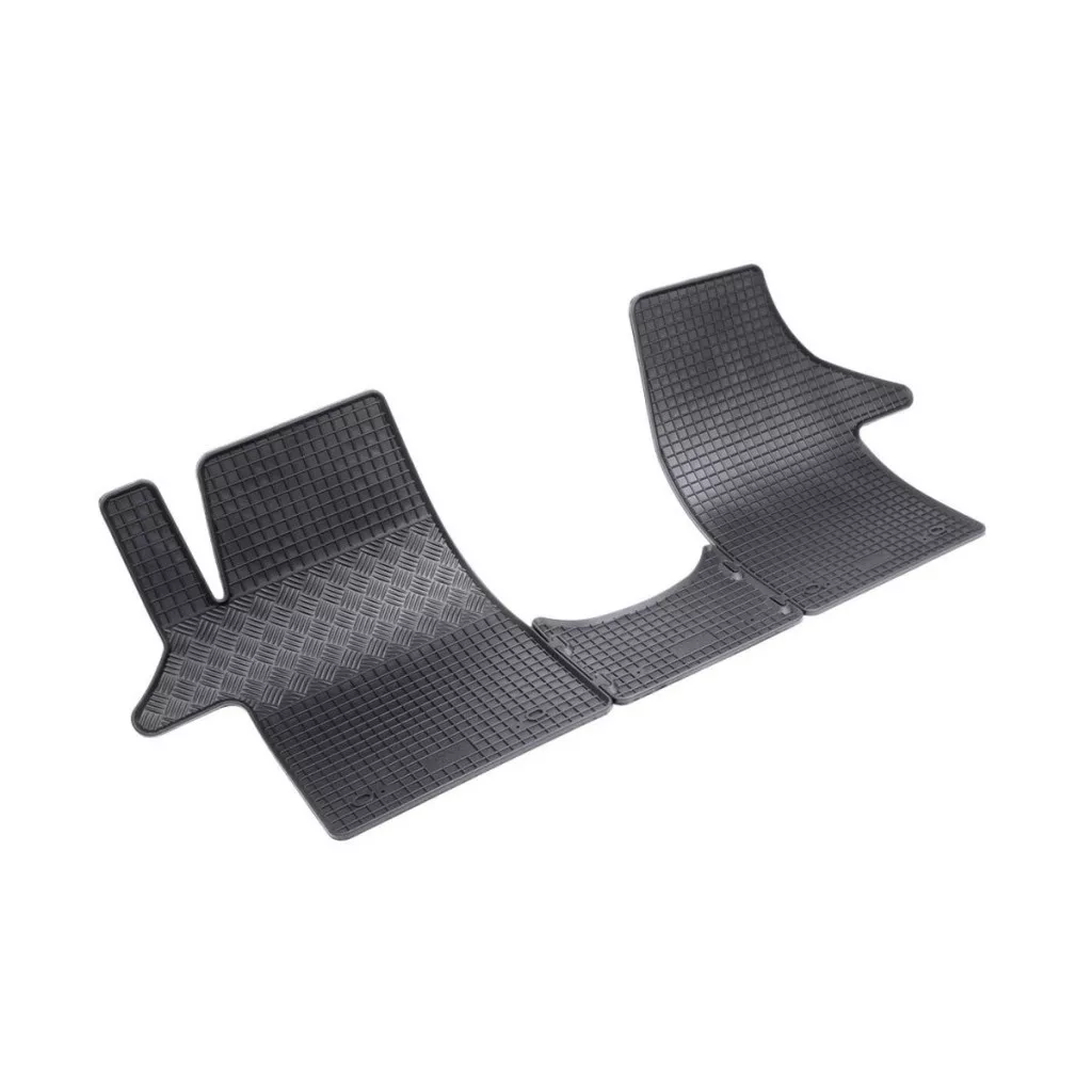 Minőségi gumiszőnyegek a VW Transporter T6 2015-2024 (2/3 hely) járműhöz. A szőnyegek hagyományos (négyzetes) dizájnnal rendelkeznek, amely megakadályozza a víz vagy az olvadó hó átszivárgását a szőnyegeken. A szőnyegek szegélye körülbelül 1 cm magas.