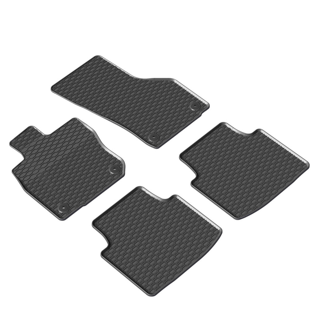 Robustní gumové autokoberce pro vůz Škoda Superb IV. Mají dezén ve tvaru pláství, díky kterému nedochází k přelévání vody nebo tajícího sněhu po kobercích. Okraj autokoberců je přibližně 1 cm vysoký.
