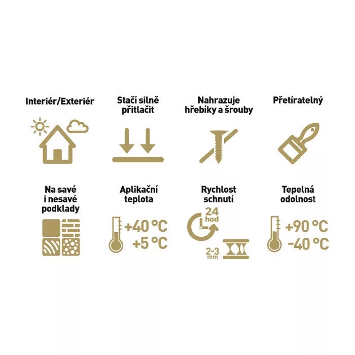 A kötés azonnal tart a ragasztás után, és nem igényel semmilyen rögzítést. A ragasztó hatékony nedves, nedvszívó és nem nedvszívó felületeken is. Nem büdös, nem tartalmaz oldószereket, izocianátokat, ftalátokat és szilikonokat. A kötés megszilárdulása után tartósan rugalmas, hőálló és átfesthető megfelelő festékekkel.