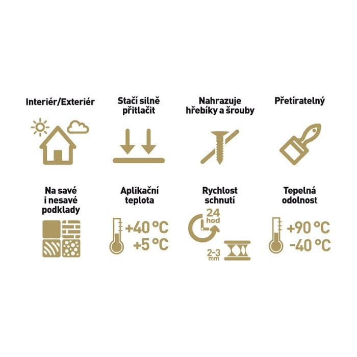 A kötések azonnal tartanak a ragasztás után, és nem igényelnek semmilyen rögzítést. A ragasztó hatékony nedves, nedvszívó és nem nedvszívó felületeken is. Nem büdös, nem tartalmaz oldószereket, izocianátokat, ftalátokat és szilikonokat. A kötés megszilárdulása után tartósan rugalmas, hőálló és átfesthető megfelelő festékekkel.