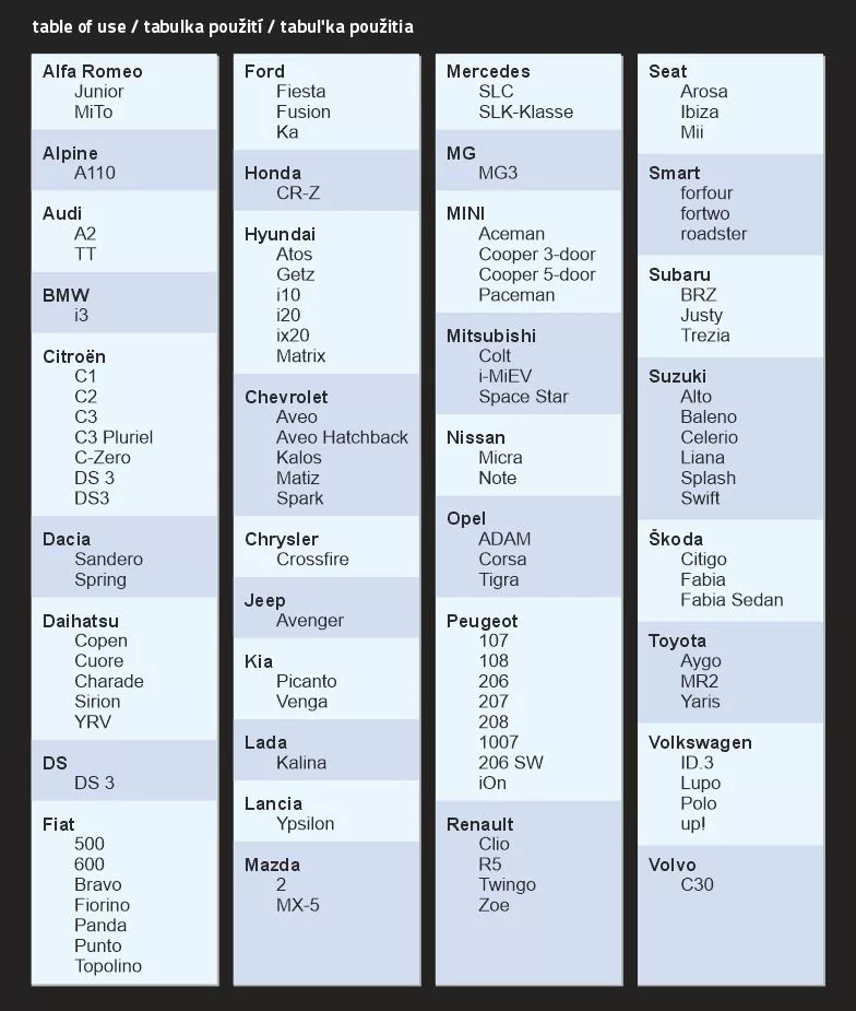 Vpravo naleznete tabulku kompatibility. Nejsou v ní uvedeny všechny vozy na trhu. Pokud v tabulce nenaleznete své auto, ale jiné s podobným typem karoserie a rozměry, bude plachta s nejvyšší pravděpodobností pasovat i na Vaše auto.