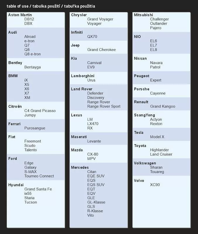 Vpravo naleznete tabulku kompatibility. Nejsou v ní uvedeny všechny vozy na trhu. Pokud v tabulce nenaleznete své auto, ale jiné s podobným typem karoserie a rozměry, bude plachta s nejvyšší pravděpodobností pasovat i na Vaše auto.