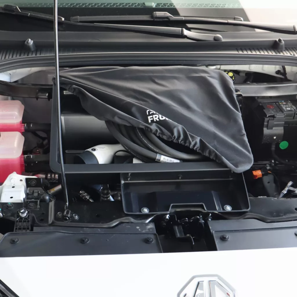 Ez egy praktikus megoldás, amely kihasználja a motorháztető alatti teret. A Frunk rekesz alkalmas töltőkábelek vagy más apróságok tárolására.