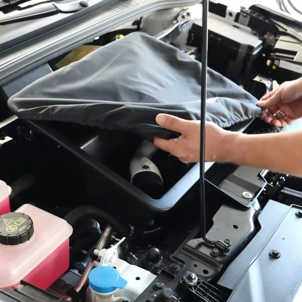 Képes útmutató az első tárolórekesz Frunk motorháztető alatti rögzítéséhez.