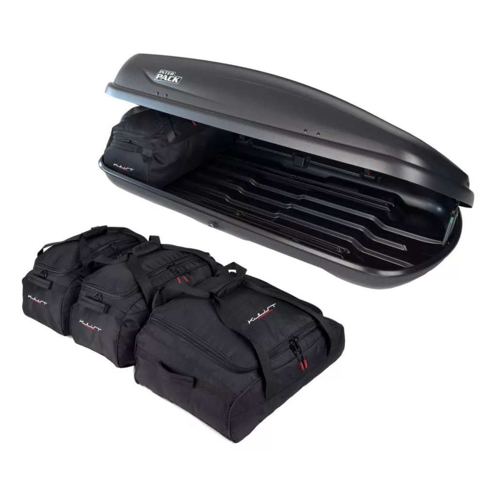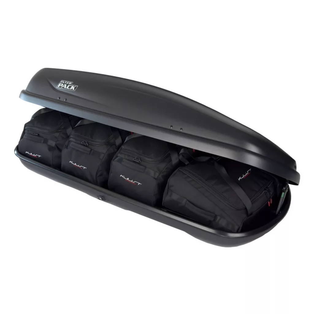 A Kjust utazótáska készlet úgy van konfigurálva, hogy maximálisan kihasználja az Interpack Traxer 5.6 tetőbox terét. A tetőbox térfogata akár 30%-kal hatékonyabban kihasználható, mint különböző méretű utazótáskák és bőröndök használatakor.