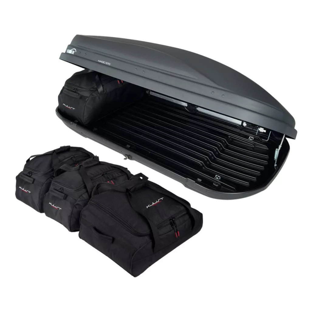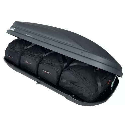 A Kjust utazótáska készlet úgy van konfigurálva, hogy maximálisan kihasználja a Hakr Magic 370 tetőbox terét. A tetőbox térfogata akár 30%-kal hatékonyabban kihasználható, mint különböző méretű utazótáskák és bőröndök használatakor.