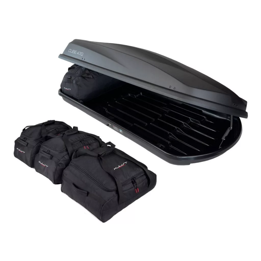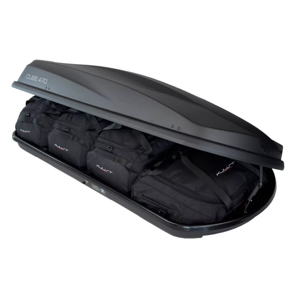 A Kjust utazótáska készlet úgy van konfigurálva, hogy a Levup Cube 470 tetőbox térfogatát maximálisan kihasználja. A tetőbox térfogata akár 30%-kal hatékonyabban van kihasználva, mint különböző méretű utazótáskák és bőröndök használatakor.