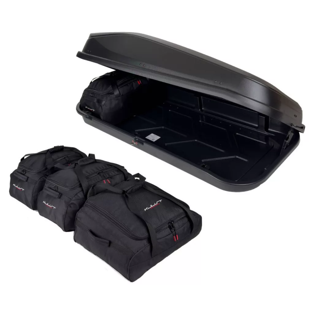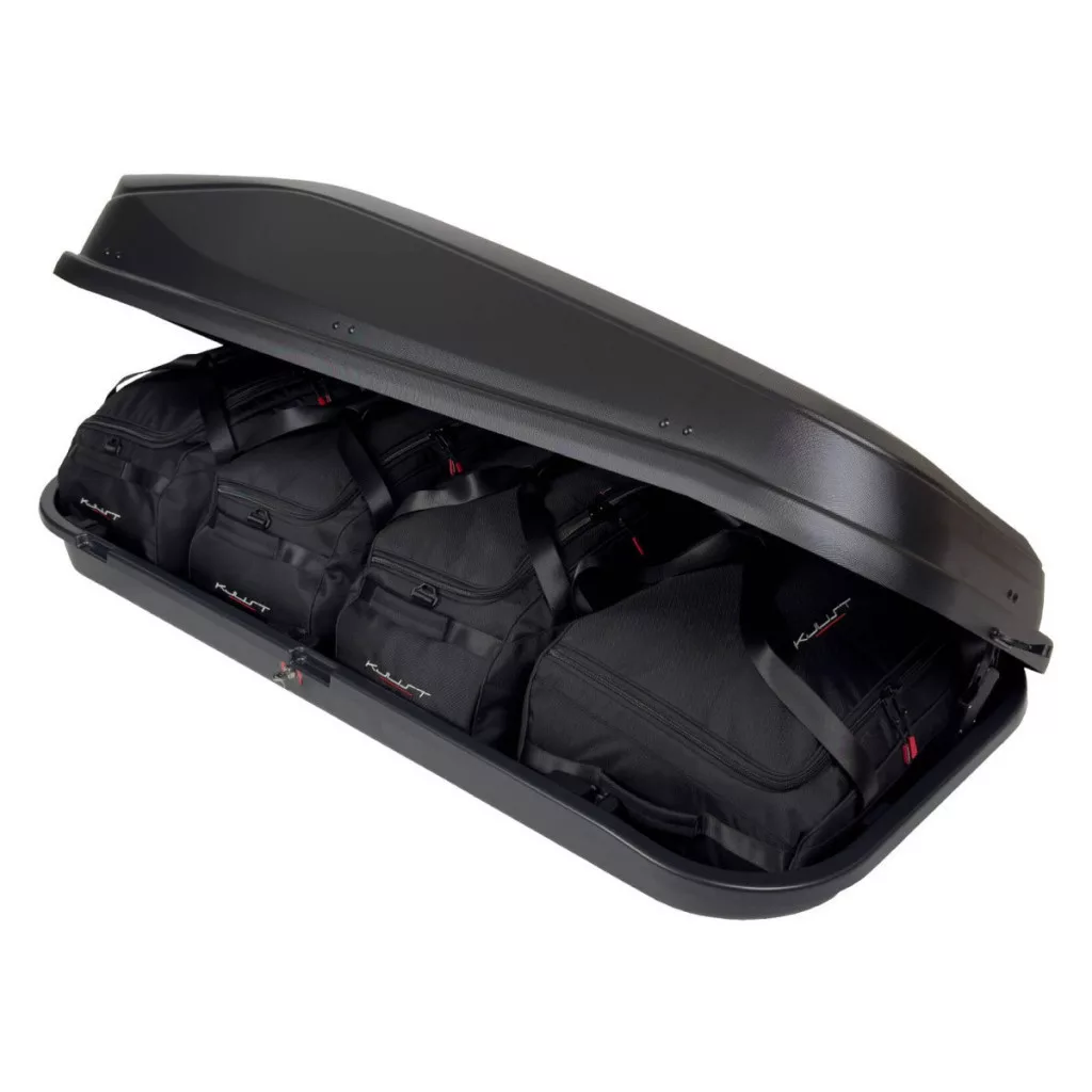 A Kjust utazótáska készlet úgy van konfigurálva, hogy maximálisan kihasználja az Aleo Easyline 430 tetőbox terét. A tetőbox térfogata akár 30%-kal hatékonyabban kihasználható, mint különböző méretű utazótáskák és bőröndök használatakor.