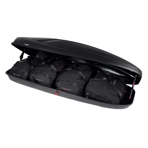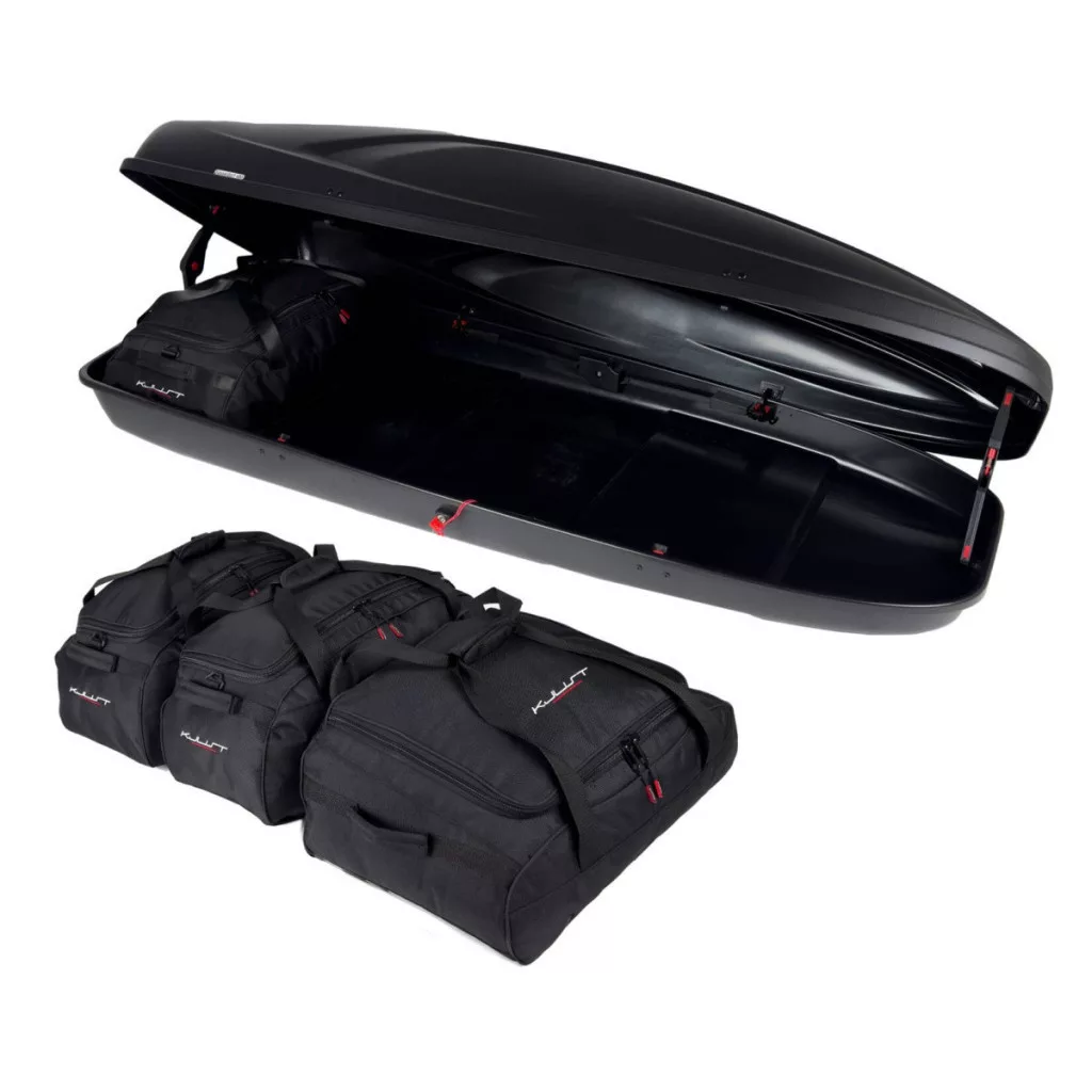 A Kjust utazótáska készlet úgy van kialakítva, hogy maximálisan kihasználja az Aroso Düsseldorf tetőbox terét. A tetőbox térfogata akár 30%-kal hatékonyabban kihasználható, mint különböző méretű utazótáskák és bőröndök használatakor.