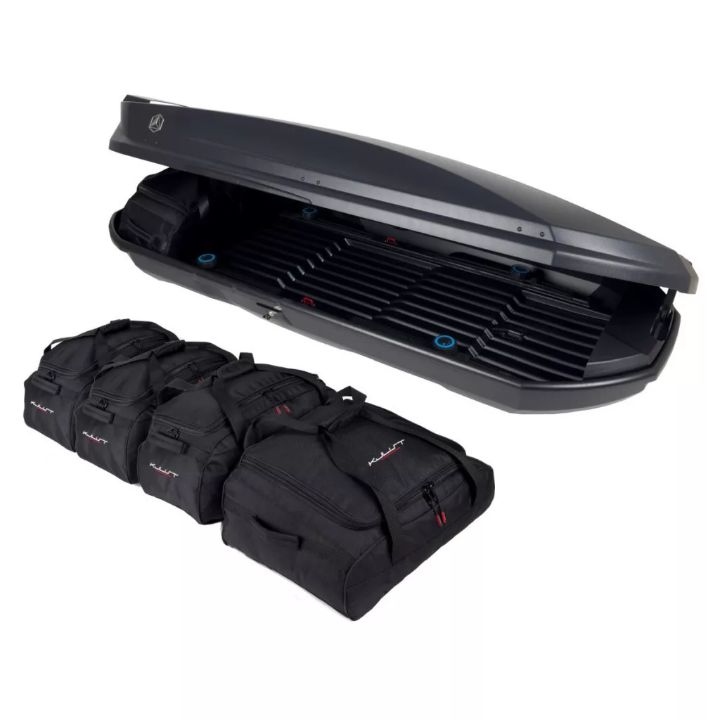 A Kjust utazótáska készlet úgy van kialakítva, hogy maximálisan kihasználja a Northline Tirol 420 tetőbox terét. A tetőbox térfogata akár 30%-kal hatékonyabban kihasználható, mint különböző méretű utazótáskák és bőröndök használatával.