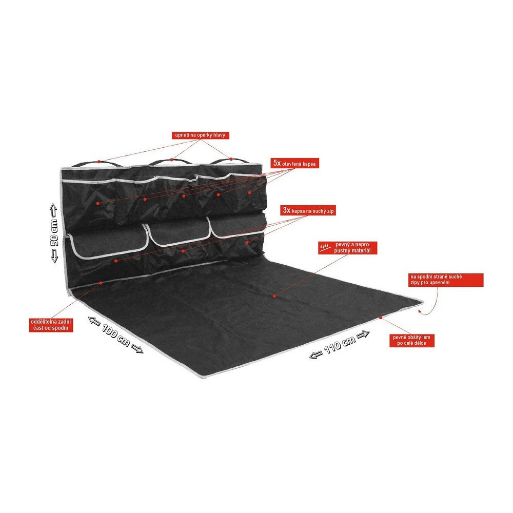 A huzat egyszerűen a hátsó ülések fejtámláira rögzíthető. Impregnált, vízlepergető anyagból készült.