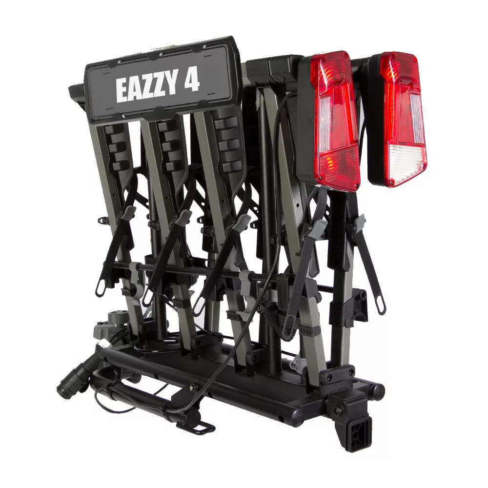 Nagyon egyszerűen használható, gyors, kényelmes, összehajtható kerékpártartó. Nagy előnye, hogy a vonóhorog gömbre ráhelyezve, megtartja magát és nem kell az egyik kezünkkel tartani, amíg meg nem szorítjuk és be nem zárjuk. A Buzz Eazzy 4 vonóhorgos kerékpártartó, erős, könnyen kezelhető 4es kerékpárszállító. Az állítható rögzítőknek köszönhetően, szinte bármilyen kerékpár, kissebb gyermek- és női kerékpár is szállítható rajta. A rögzítő heveder, maximum 75 mm átmérőjű kerékpárvázat tud átfogni. Az Eazzy4 kerékpárszállítóval öröm lesz az utazás, mert könnyű használni, összecsukni, praktikus, négyes kerékpárszállító vonóhorogra. Egyenként maximum 20kg súlyú kerékpárokat tudunk szállítani, de a kerékpártartó terhelhetősége maximum 60kg. A Buzz Rack Eazzy 4 kerékpártartó szerkezet minősége, mind a hegesztést, festést, kivitelezést, összeillesztést tekintve példaértékű.