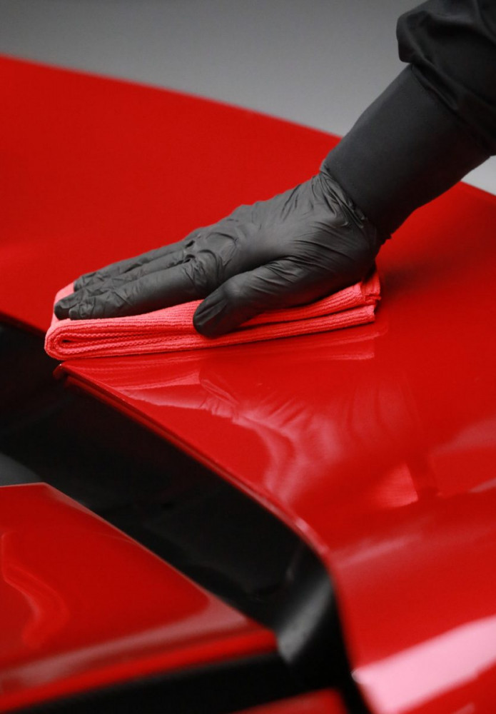 1. A termék felhordása után párologni kezd. Amikor apró kis gyöngyök formálódnak és egy filmréteg kezd kialakulni, akkor jött el az ideje, hogy visszafénysítsük a bevonatot a piros  mikroszálas kendővel. Meleg napokon ez 1-2 percet vesz igénybe, míg hűvösebb napokon általában 3-5 percet. Használja ezt az első panelt útmutatónak az autó többi részének a kezelése során.